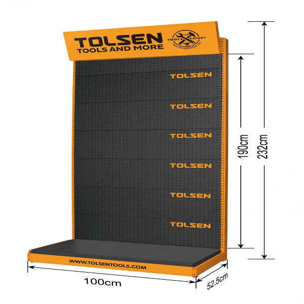 Tolsen 83037 là kệ trưng bày dụng cụ chính hãng được thiết kế đặc biệt cho các cửa hàng, đại lý phân phối và showroom dụng cụ cơ khí, điện, sửa chữa. Kệ được làm từ thép các-bon cao cấp phủ sơn tĩnh điện, có hộp đèn logo Tolsen phía trên giúp tăng nhận diện thương hiệu và làm nổi bật không gian trưng bày.