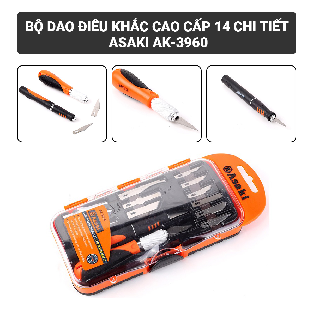 Bộ dao điêu khắc cao cấp 14 chi tiết Asaki AK-3960 là dụng cụ chuyên nghiệp dành cho nghề điêu khắc, chế tác thủ công, mô hình và mỹ thuật công nghiệp. Bộ sản phẩm bao gồm nhiều loại lưỡi dao và cán dao khác nhau, giúp người dùng dễ dàng gia công chi tiết, khắc, rọc, tỉa và chạm khắc trên nhiều chất liệu như gỗ, nhựa, da, sáp, thạch cao, mô hình composite...