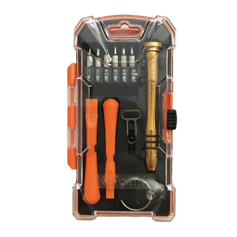 Bộ dụng cụ Asaki AK-9077 là bộ gồm 17 chi tiết chuyên dụng dành cho công việc sửa chữa điện thoại, thiết bị điện tử và linh kiện nhỏ.