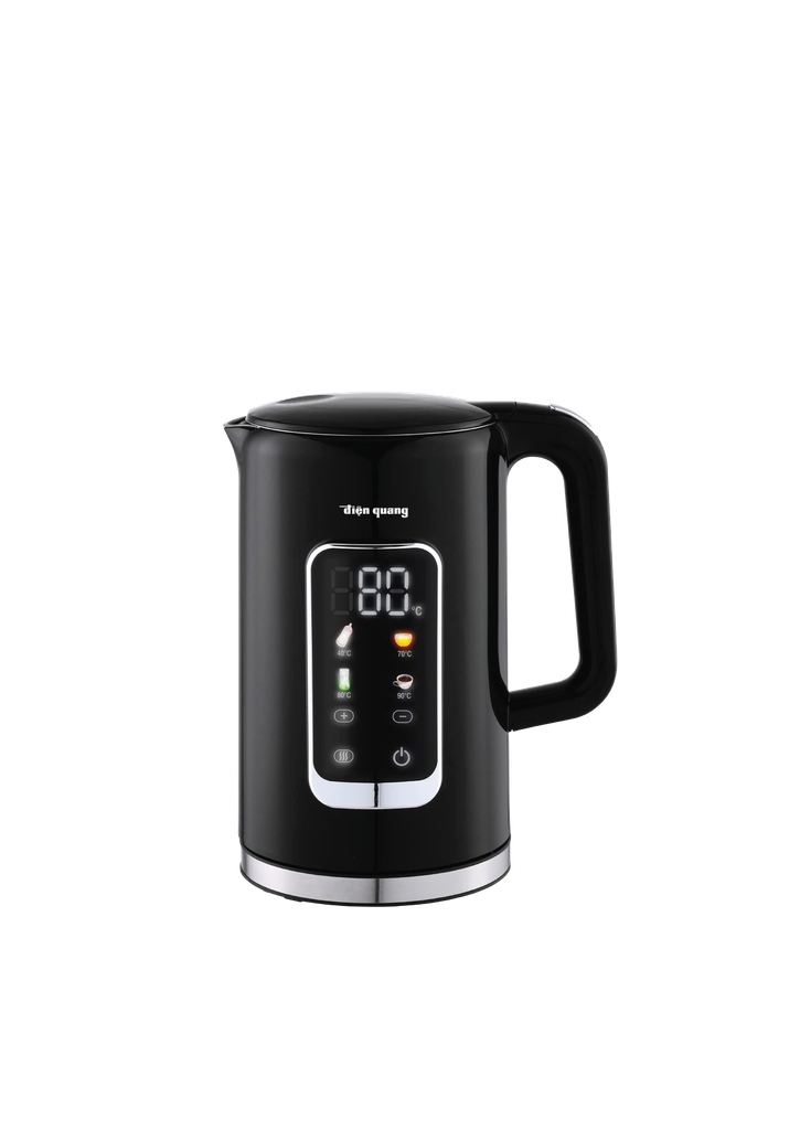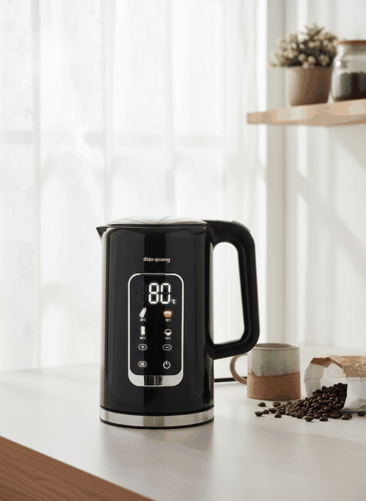 Ấm đun nước siêu tốc Điện Quang được thiết kế với vật liệu inox 304 cao cấp, bền đẹp, dễ vệ sinh, đảm bảo an toàn vệ sinh thực phẩm. Sản phẩm tích hợp bảng điều khiển cảm ứng nhiều chức năng, đế xoay 360° tiện lợi và khả năng tự động ngắt điện khi nước sôi/cạn, mang lại sự an toàn tuyệt đối cho người dùng.