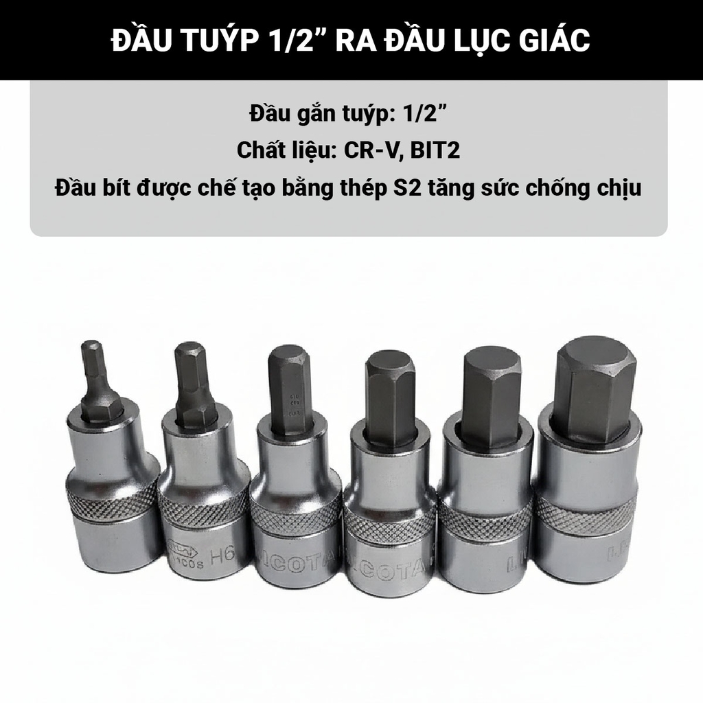 Đầu tuýp 1/2'' ra đầu lục giác 5-12mm Licota