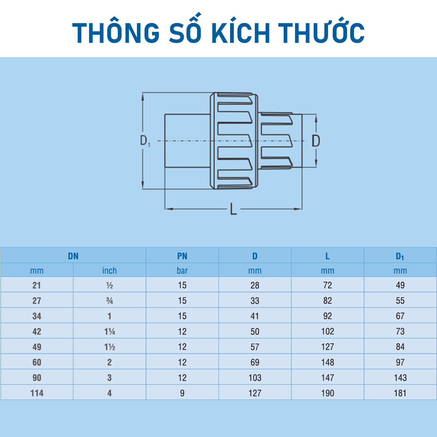 Kích thước danh nghĩa : Ø 21, Ø 27, Ø 34, Ø 42, Ø 49, Ø 60, Ø 90, Ø 114