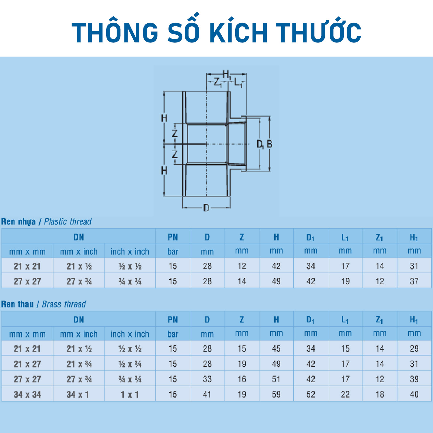 Có loại ren trong bằng đồng (thau) hoặc ren trong bằng nhựa |