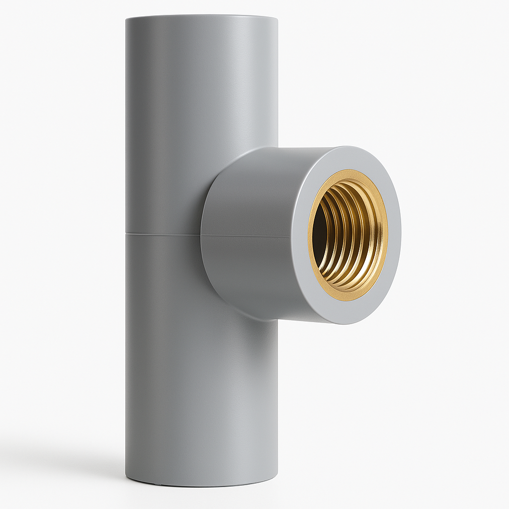 T ren trong và tê ren trong thau là phụ kiện nối ống PVC-U hệ inch, dùng để chia nhánh đường ống và chuyển đổi từ ống trơn sang ren trong (đồng hoặc nhựa). Sản phẩm kết hợp đầu ren (bằng đồng hoặc nhựa PVC) và thân nhựa, giúp kết nối thiết bị, van, vòi hoặc phụ kiện có phần ren ngoài một cách chắc chắn và kín khít.