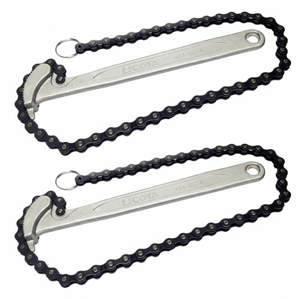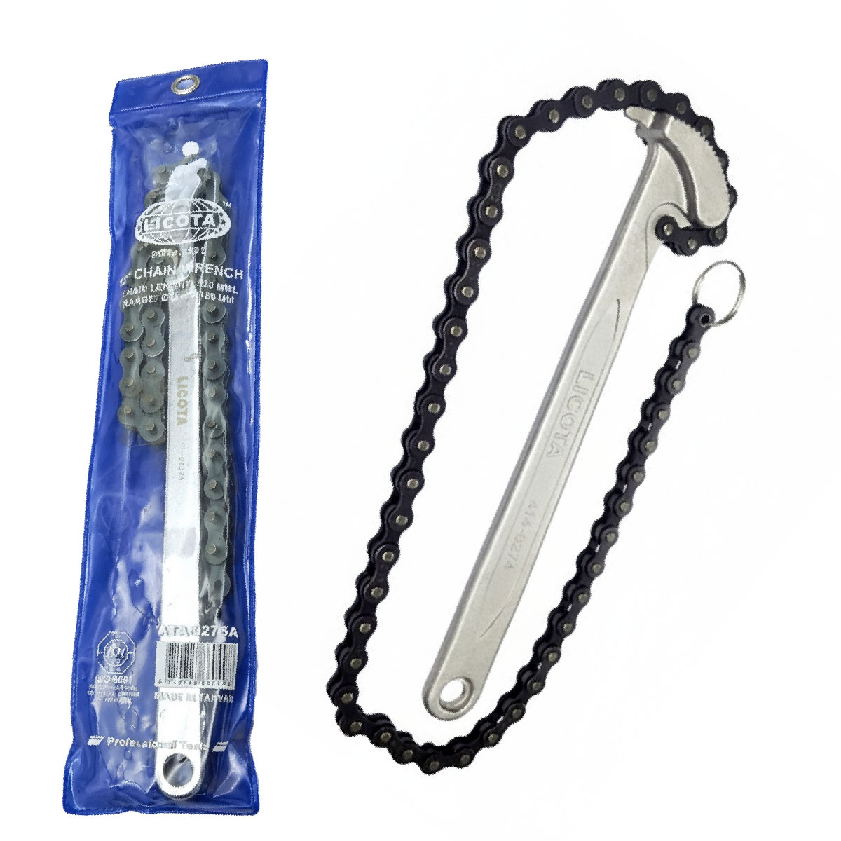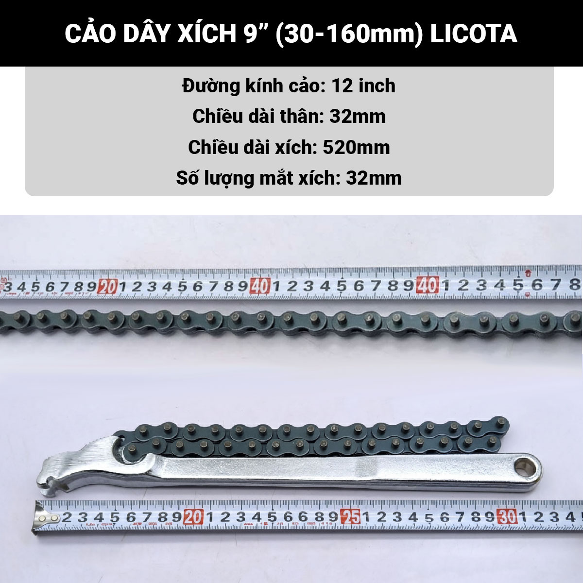 Phần dây xích dài 590mm được làm từ thép cao cấp phủ xi đen chống gỉ, có cấu trúc uốn lượn linh hoạt, giúp bám chắc vào chi tiết cần mở, tạo ma sát tốt và chịu được lực xiết cao. Nhờ thiết kế thông minh này, người dùng có thể điều chỉnh linh hoạt đường kính mở 30 – 160mm, phù hợp với nhiều kích cỡ chi tiết khác nhau.
