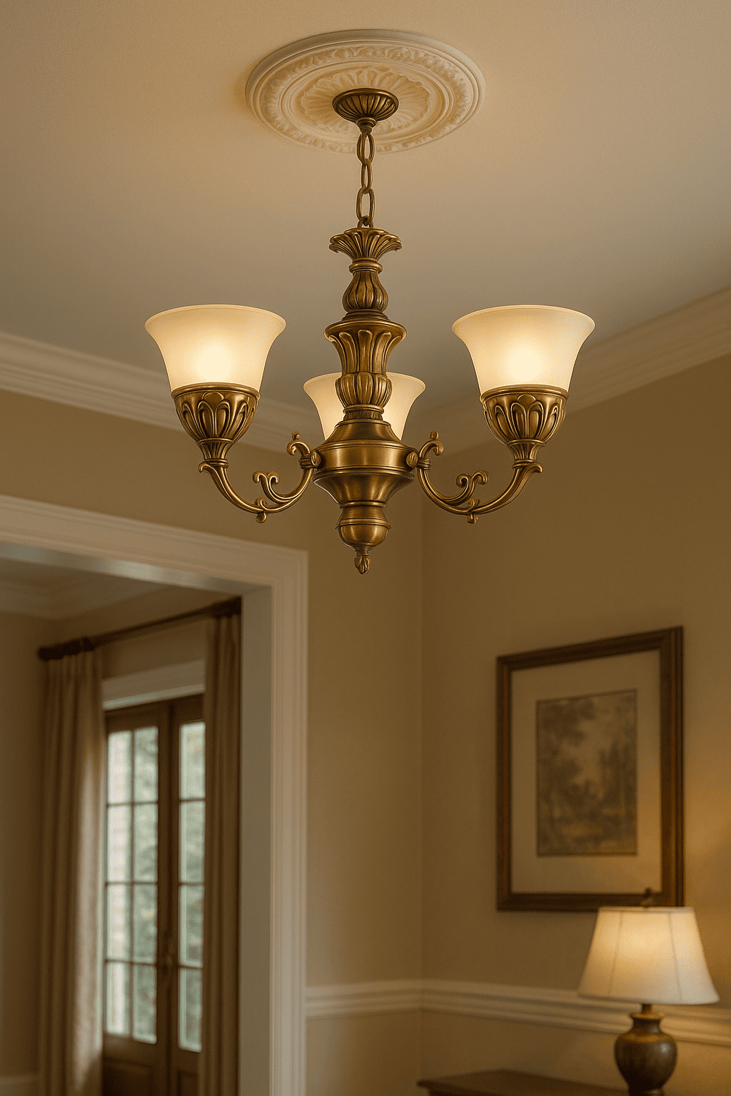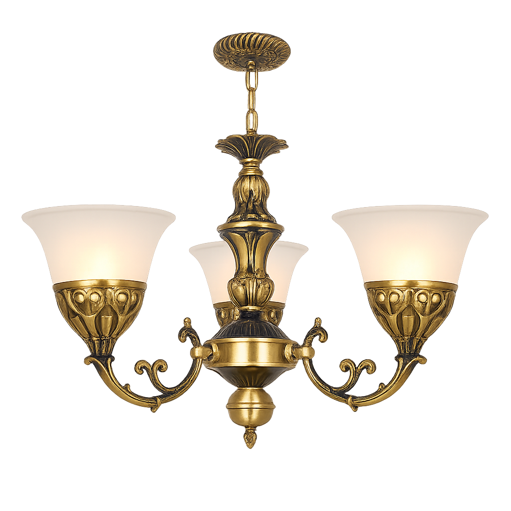Thiết kế cân đối: Gồm 3 tay đèn uốn lượn mềm mại, chao thủy tinh cao cấp trong suốt, giúp ánh sáng tỏa đều và lung linh.