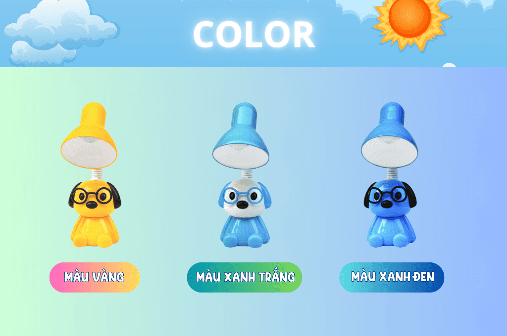 Thiết kế hình chú chó dễ thương: ba màu lựa chọn – vàng, xanh dương, xanh đậm – phù hợp sở thích của bé.