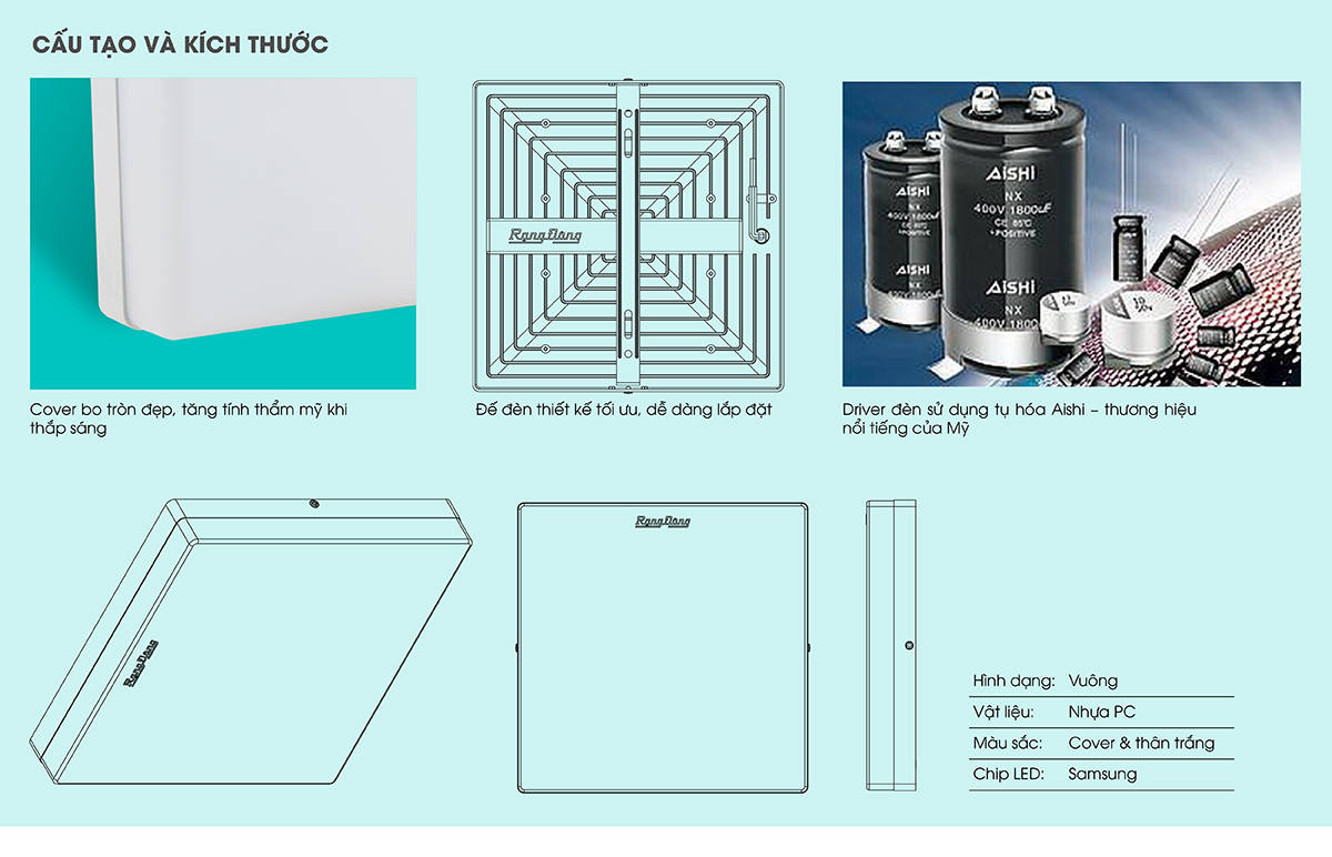 Kích thước 300x300mm, công suất 24W, ánh sáng trắng sáng rõ, trung thực.