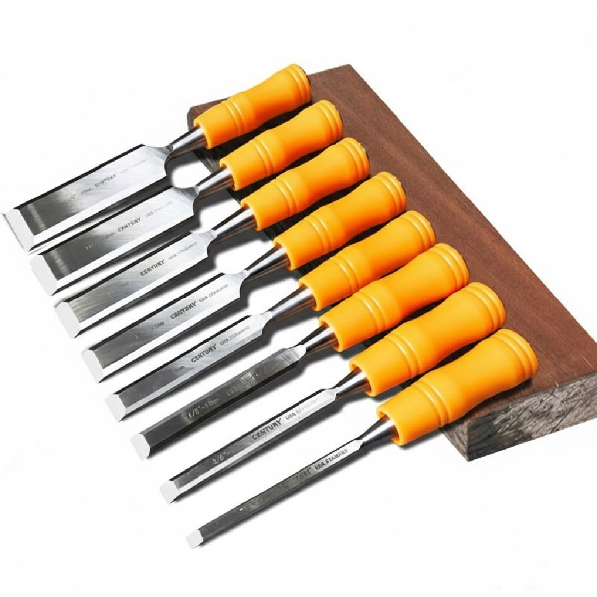 Cán đục được làm từ nhựa cao cấp màu cam, có độ bám tốt, giúp cầm nắm vững chắc, không trơn trượt khi thao tác. Phần đầu cán được gia cố bằng vòng kim loại, giúp chịu được lực gõ mạnh của búa mà không bị nứt vỡ. Đục gỗ Century có nhiều kích thước từ 10mm đến 38mm, phù hợp với đa dạng công việc như gia công, chạm khắc, và lắp ráp đồ gỗ.