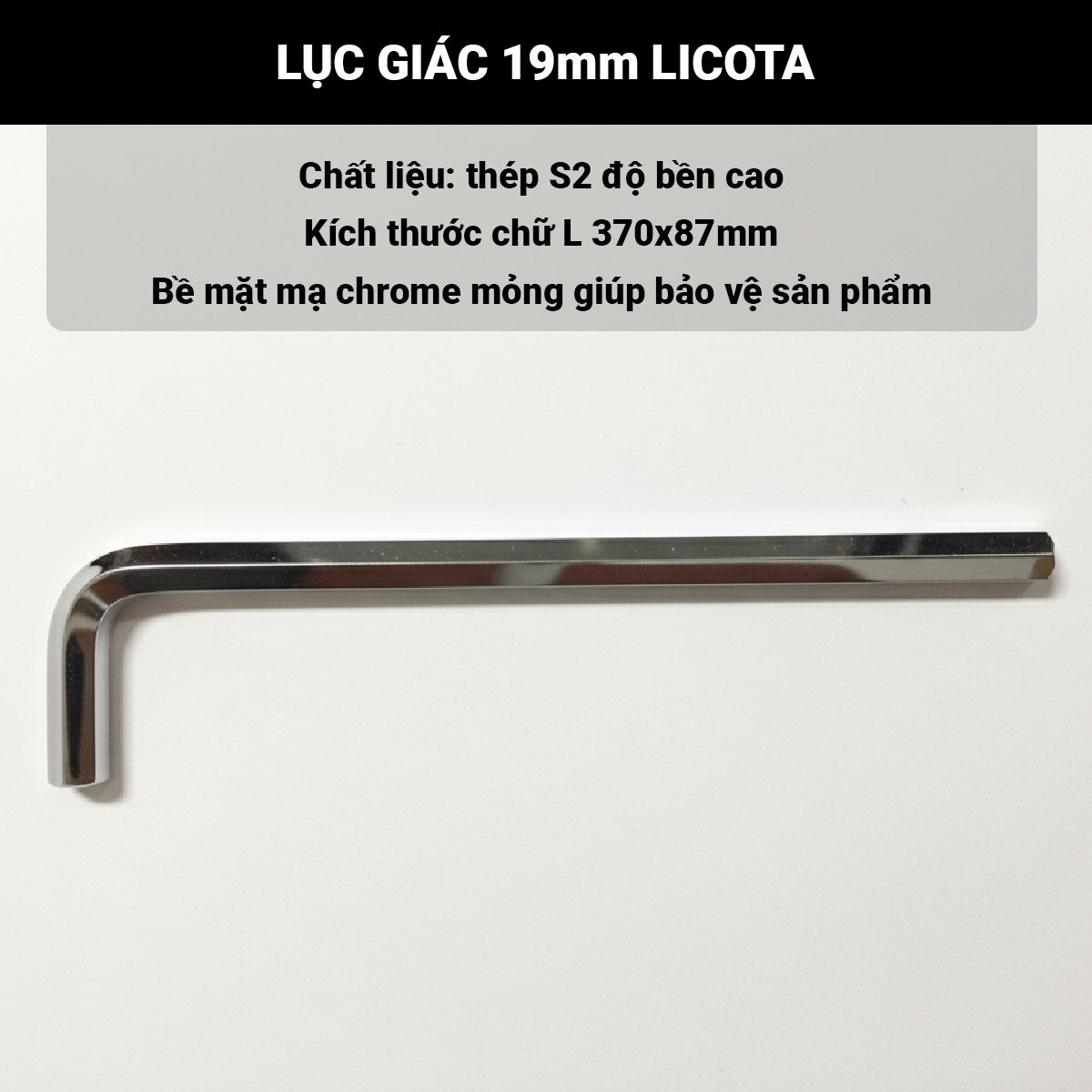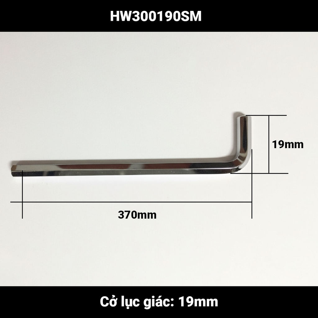 Kích thước tiêu chuẩn 370mm (cạnh dài) và 87mm (cạnh ngắn), đầu lục giác 19mm phù hợp cho công việc trong ngành cơ khí, công nghiệp nặng, bảo trì thiết bị, gara ô tô và xưởng sản xuất.