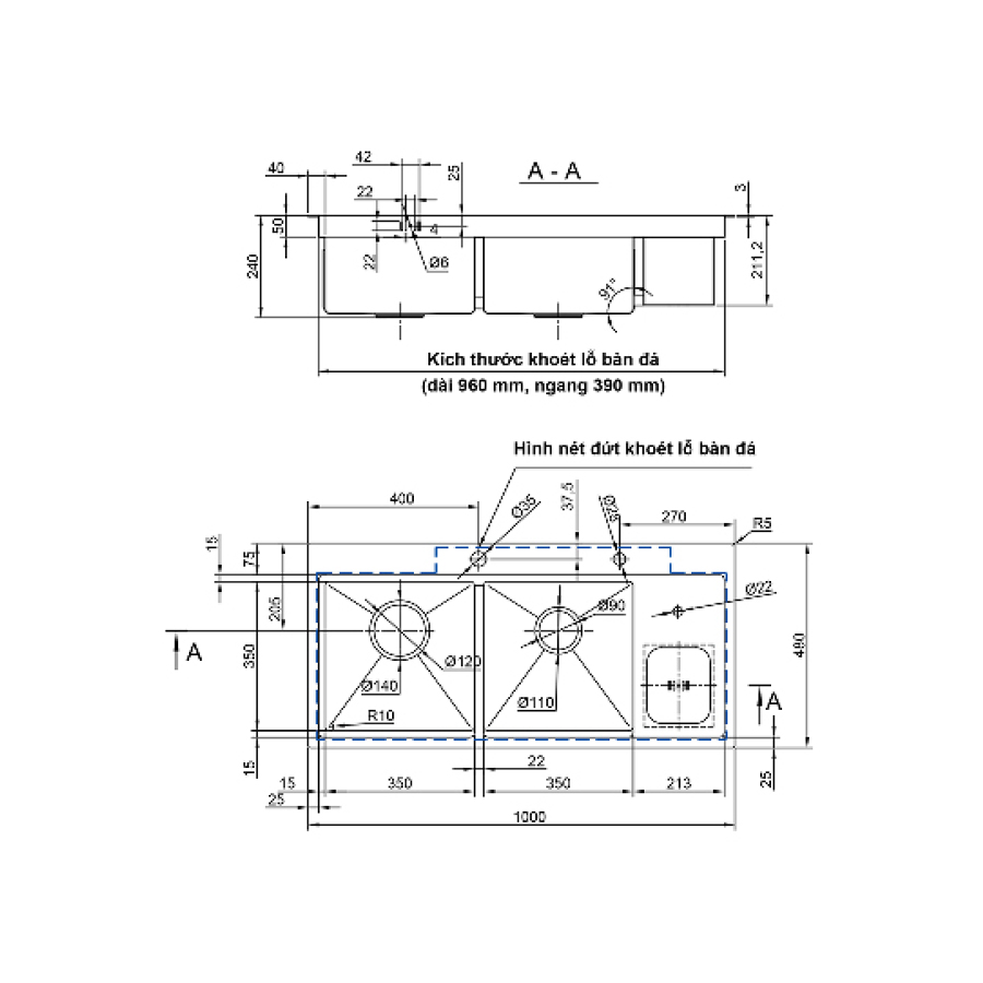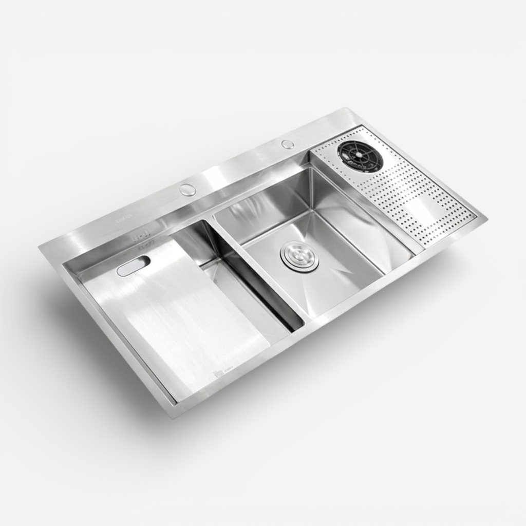 Chậu được hoàn thiện theo dạng chậu thủ công (Handmade), với các góc cạnh sắc nét, thành chậu dày, lòng chậu sâu, giúp tối ưu không gian rửa và tăng tính sang trọng. Hệ thống thoát nước được thiết kế khoa học, kết nối chặt chẽ, đảm bảo nước lưu thông mượt mà, không ứ đọng, không rò rỉ và hạn chế tối đa mùi khó chịu.