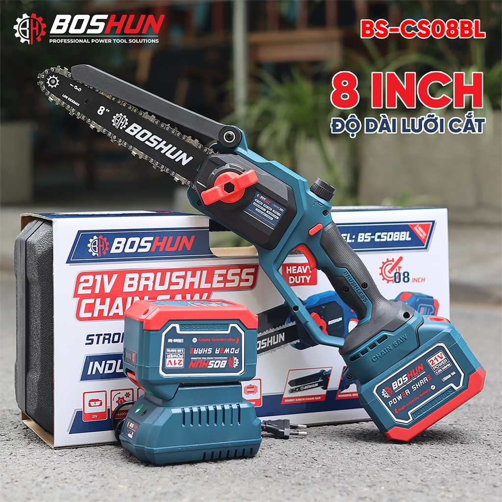 Máy Cưa Xích Pin Boshun BS-CS08BL Lam Xích 8 INCH, Không Chổi Than, 100% Lõi Đồng