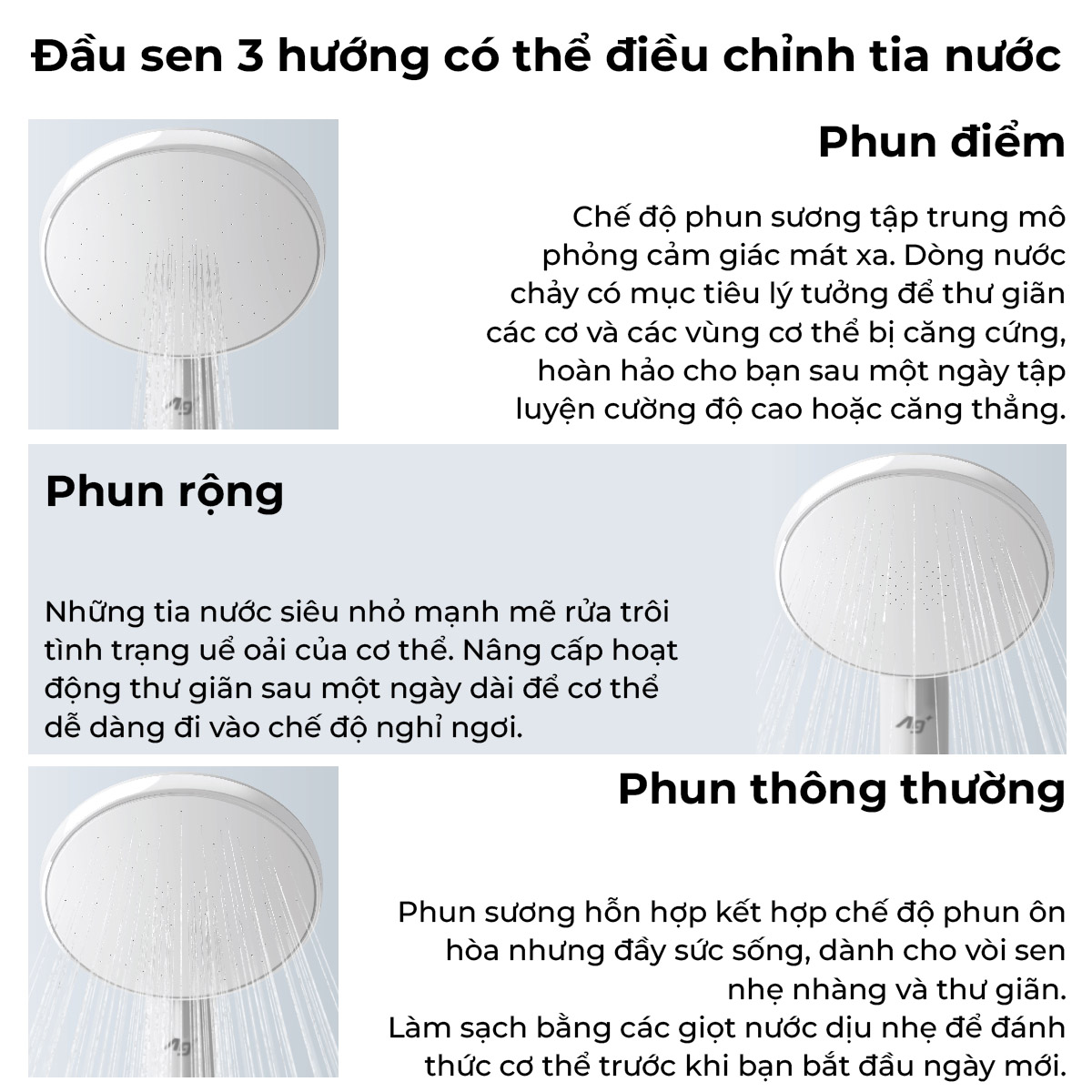 Hỗ trợ sen đi kèm 3 chế độ phun : phun nhẹ nhàng, phun rộng và phun điểm — giúp bạn linh hoạt tùy theo nhu cầu: thư giãn, làm sạch hay xả nhanh sau mỗi ngày làm việc.