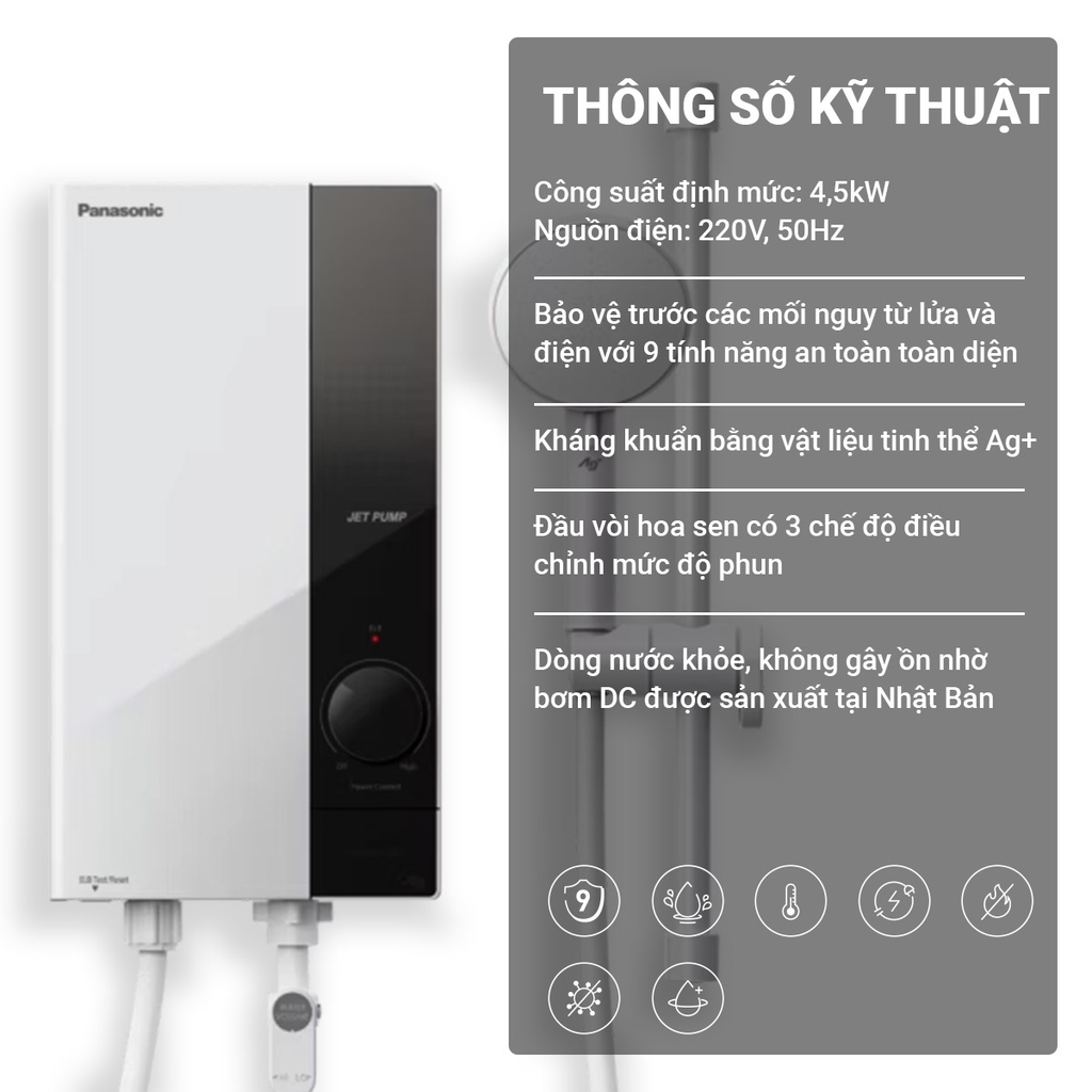 Panasonic DH-4UP1VW tích hợp 9 tính năng an toàn — từ chống nước bắn, chống giật, chống quá nhiệt, chống rỉ điện đến ngắt nhiệt khi nước đột phá quá 55 °C để hạn chế.