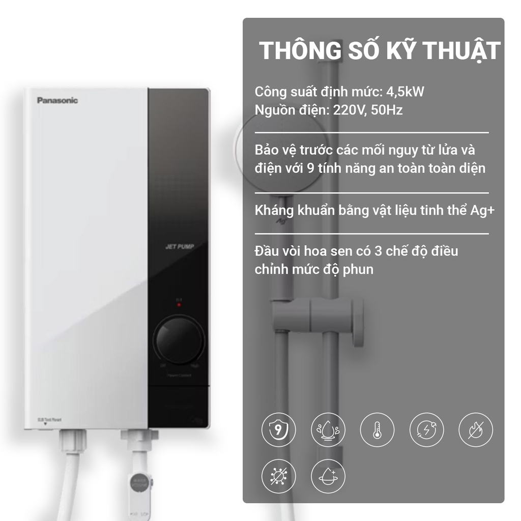 Panasonic DH-4US1VW hoạt động với nguồn điện 220 V / 50 Hz và công suất định mức 4,5 kW , mang đến nước nóng thì khi tắm mà không cần bình chứa. Máy phù hợp với gia đình có nhu cầu sử dụng nước nóng thường xuyên và ổn định.