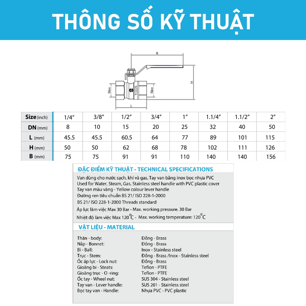 Bi van: Làm từ đồng mạ Niken , có độ bóng cao giúp đóng mở nhẹ nhàng , đảm bảo kín tuyệt đối , hạn chế rò rỉ trong quá trình vận hành.