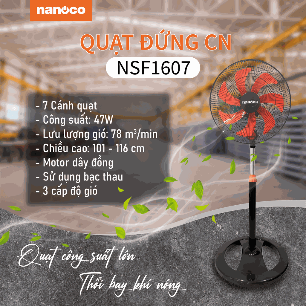 Quạt đứng Nanoco là dòng sản phẩm cơ điện phổ thông, giá rẻ nhưng mang lại hiệu quả làm mát vượt trội. Sản phẩm được sử dụng rộng rãi trong phòng ngủ, phòng khách, văn phòng, nhà xưởng hoặc ngoài trời, nhờ khả năng tạo gió mạnh mẽ và làm dịu nhanh không khí oi nóng.