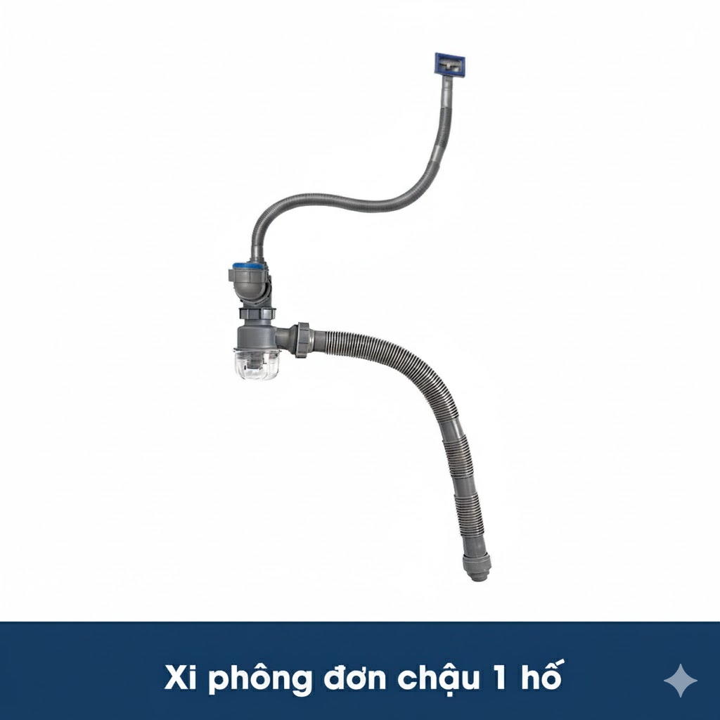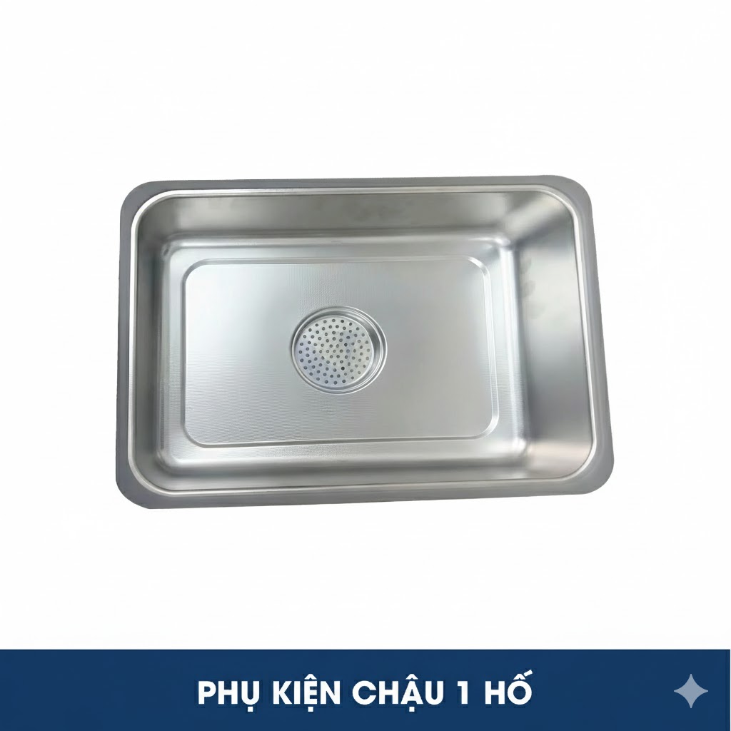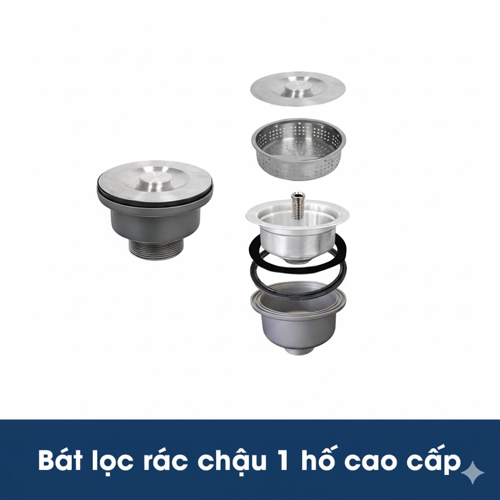 Phụ kiện đi kèm: bộ xi phông PP Hàn Quốc, bát lọc rác Ø165 mm, tem mác đầy đủ.