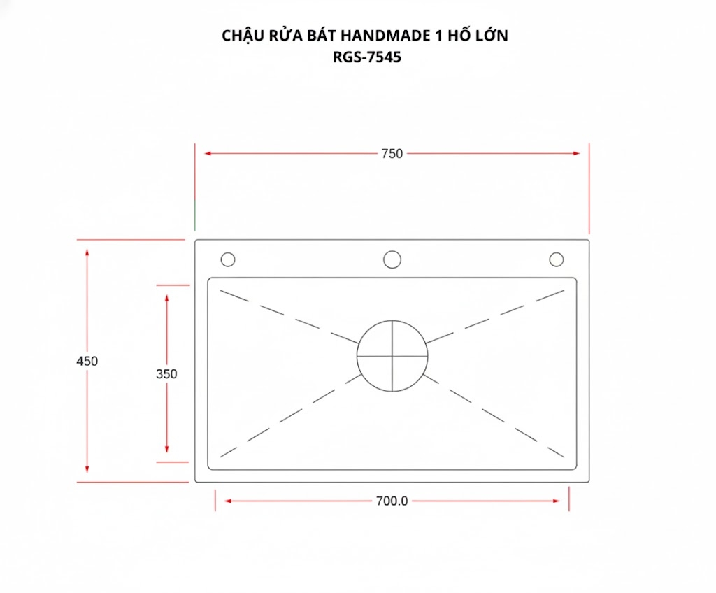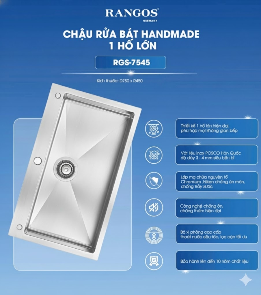 [Rangos] Chậu rửa bát handmade 1 hố lớn RGS-7545