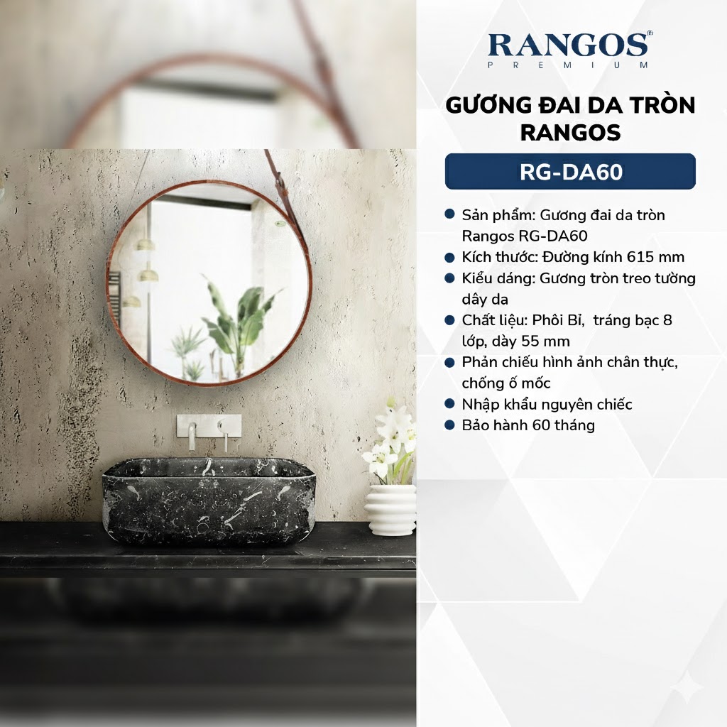 Rangos RG-DA60 là mẫu gương tròn treo dây đai da cao cấp mang phong cách tối giản – sang trọng, là điểm nhấn hoàn hảo cho nhà tắm, phòng ngủ hoặc bàn trang điểm. Gương sử dụng phôi Bỉ cao cấp, được tráng bạc 8 lớp cho độ phản chiếu chân thực, không méo hình và khả năng chống ố mốc, chống oxy hóa vượt trội.