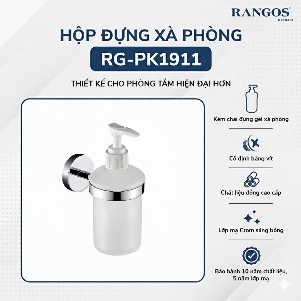RANGOS RG-PK1911 là mẫu hộp đựng xà phòng gắn tường cao cấp với thiết kế sang trọng, nhỏ gọn và tiện lợi. Sản phẩm đi kèm chai đựng xà phòng, phù hợp cho nhà tắm, khu rửa tay hoặc các không gian vệ sinh hiện đại.