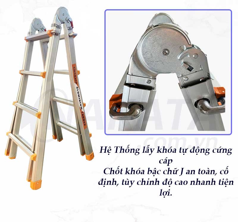 Khóa an toàn tự động: Hệ thống khóa sập chắc chắn, thao tác nhanh, giữ thang cố định vững vàng.