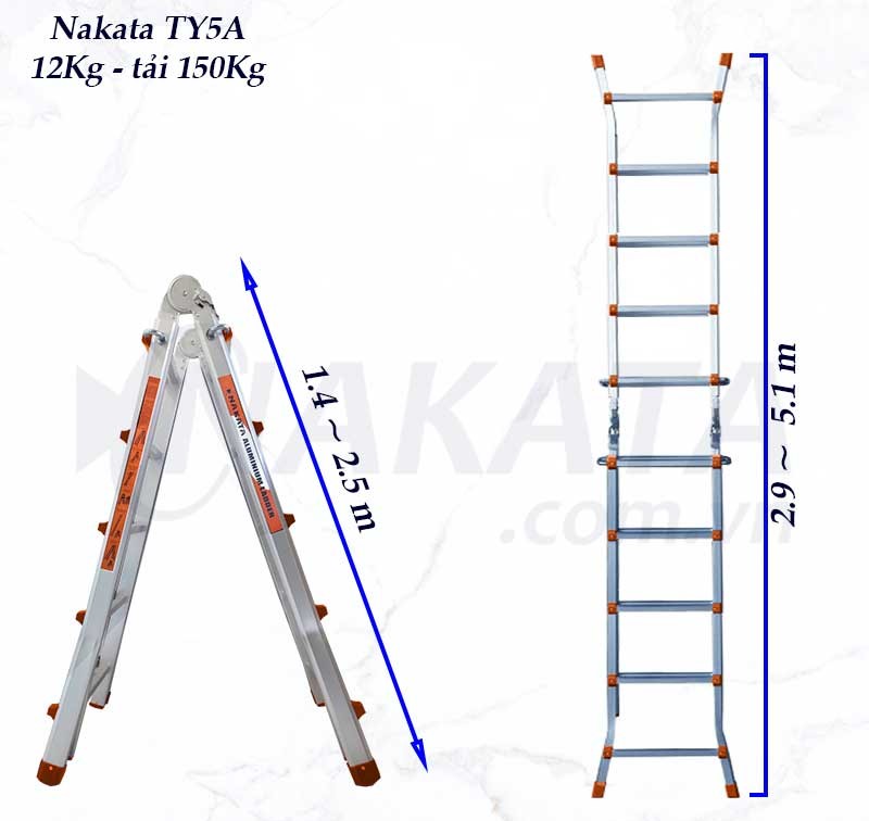 Thang nhôm gấp đa năng Nakata TY5A được gia công trên dây chuyền công nghệ Nhật Bản, nhập khẩu nguyên chiếc 100%. Thiết kế hiện đại, tiện lợi, đáp ứng tiêu chuẩn an toàn Quốc Tế EN131, SGS. Với khả năng biến đổi nhiều hình dáng như chữ A, chữ I, giàn giáo mini, TY5A phù hợp cho mọi nhu cầu từ gia đình đến công trình chuyên nghiệp.