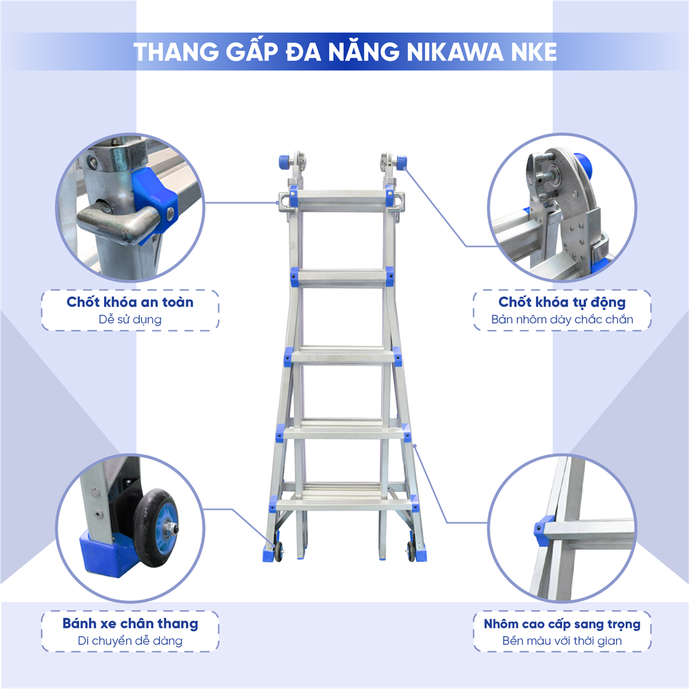 Nikawa NKG-46C là mẫu thang nhôm gấp đoạn cao cấp, thiết kế đa năng, đáp ứng nhiều nhu cầu làm việc trên cao trong gia đình lẫn công trình. Sản phẩm được sản xuất theo công nghệ Nhật Bản, đảm bảo chất lượng, độ bền và tính an toàn vượt trội.