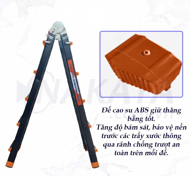 Đế cao su chống trượt: Chân thang được trang bị đế cao su rộng, giúp tăng ma sát, giữ thang vững trên mọi địa hình và bảo vệ bề mặt sàn nhà.