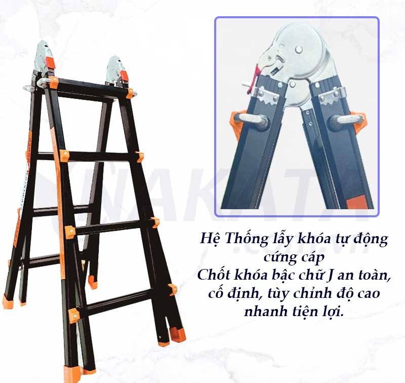 Hệ thống khóa tự động an toàn: Chốt khóa chữ J được gia công tỉ mỉ, giúp khóa thang nhanh chóng, chắc chắn, đảm bảo an toàn khi sử dụng.