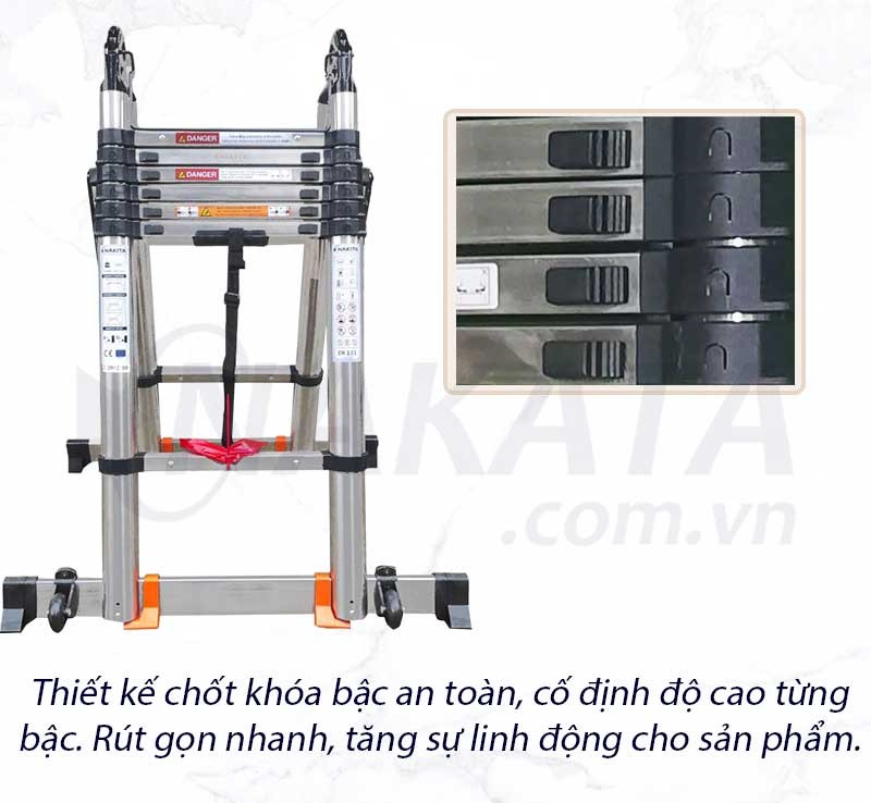 Thang rút đôi inox Nakita TM264 được thiết kế dạng chữ A chắc chắn, đáp ứng nhu cầu làm việc ở độ cao lớn hơn, đồng thời có thể chuyển sang dạng thang thẳng để tăng chiều cao sử dụng.