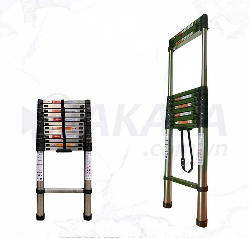 Đai nhựa liên kết chắc chắn giữa bậc và thân thang, vừa khít, giảm rung lắc. Chốt khóa tự động kết hợp ngàm khóa bên trong cố định chiều cao an toàn, thao tác thu gọn nhanh.