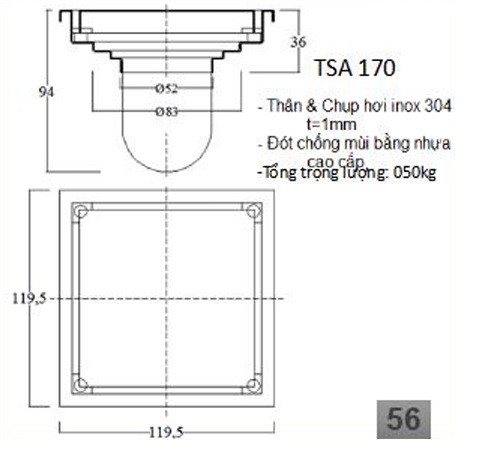 Thoát sàn âm TSA170 thuộc thương hiệu Bảo Inox, được sản xuất bằng công nghệ dập khuôn hiện đại, chế tác từ Inox 304 cao cấp. Sản phẩm có khả năng chống gỉ sét, chống ăn mòn, phù hợp với môi trường thường xuyên tiếp xúc với nước, acid hoặc muối. Với thiết kế âm tường, TSA170 vừa thẩm mỹ vừa mang lại hiệu quả thoát nước vượt trội.