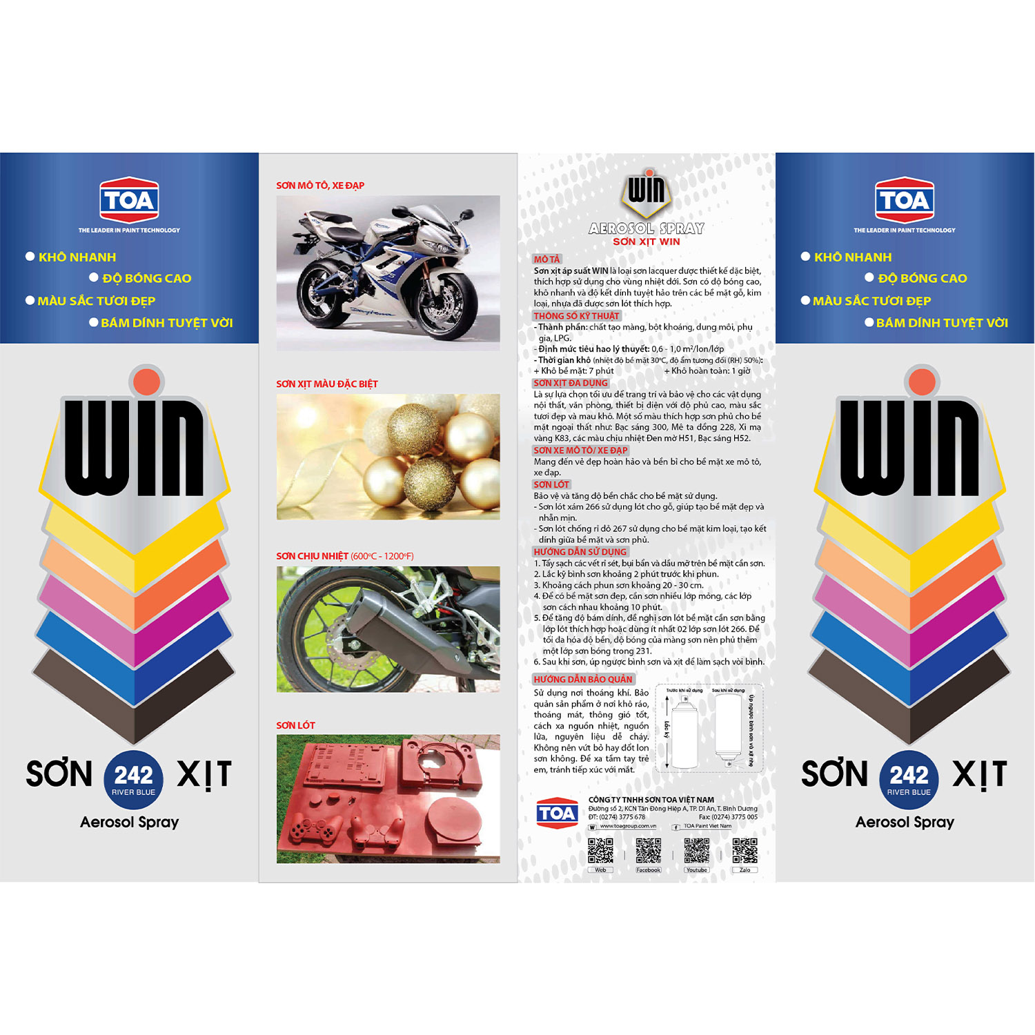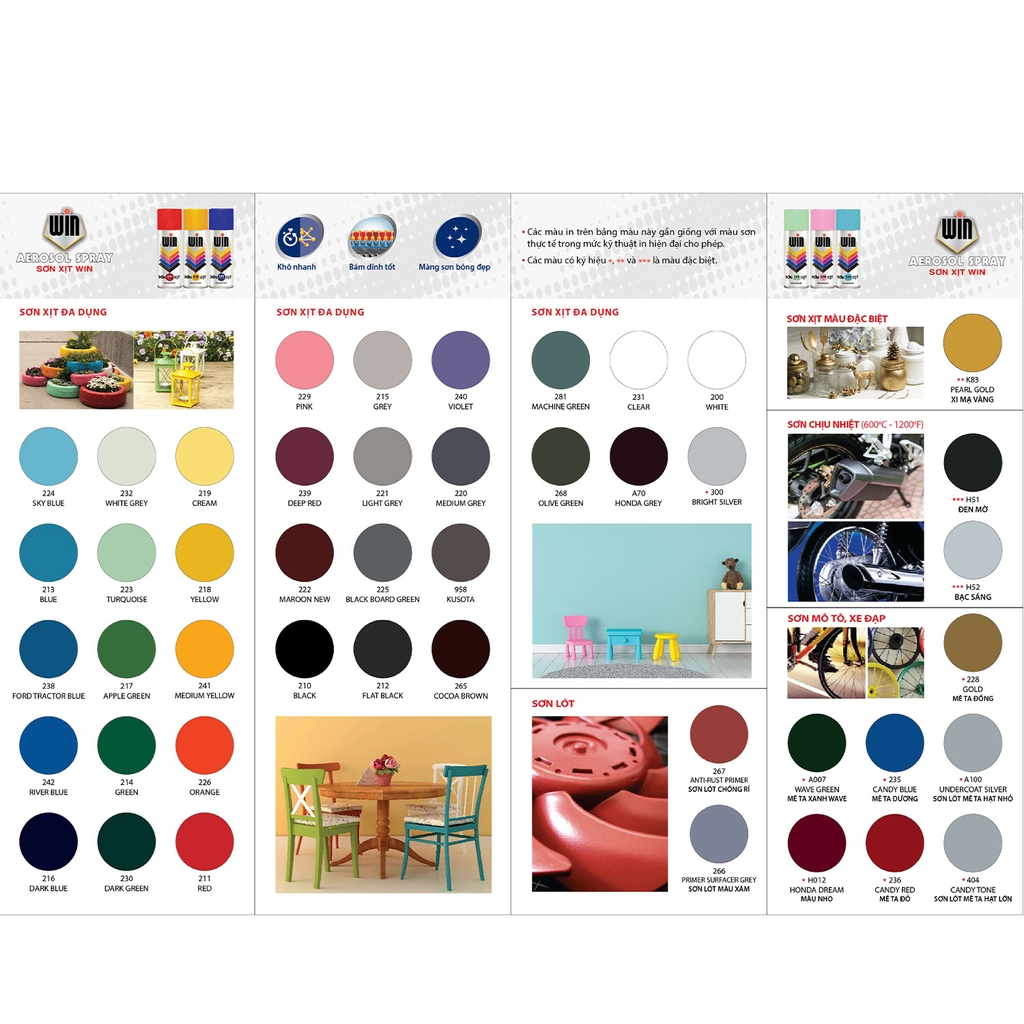 Sơn xịt WIN là dòng sơn Lacquer cao cấp được nghiên cứu và sản xuất theo công thức đặc biệt, phù hợp với điều kiện khí hậu nhiệt đới nóng ẩm tại Việt Nam. Sản phẩm nổi bật với độ bóng cao, thời gian khô nhanh, bám dính cực tốt trên nhiều loại vật liệu, giúp bảo vệ và làm mới bề mặt hiệu quả.